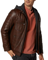 This brown hooded leather jacket is stylish and practical. The real lambskin leather feels luxurious, and the fit is excellent. The detachable hood is perfect for keeping warm on chilly days and adds versatility to the jacket.