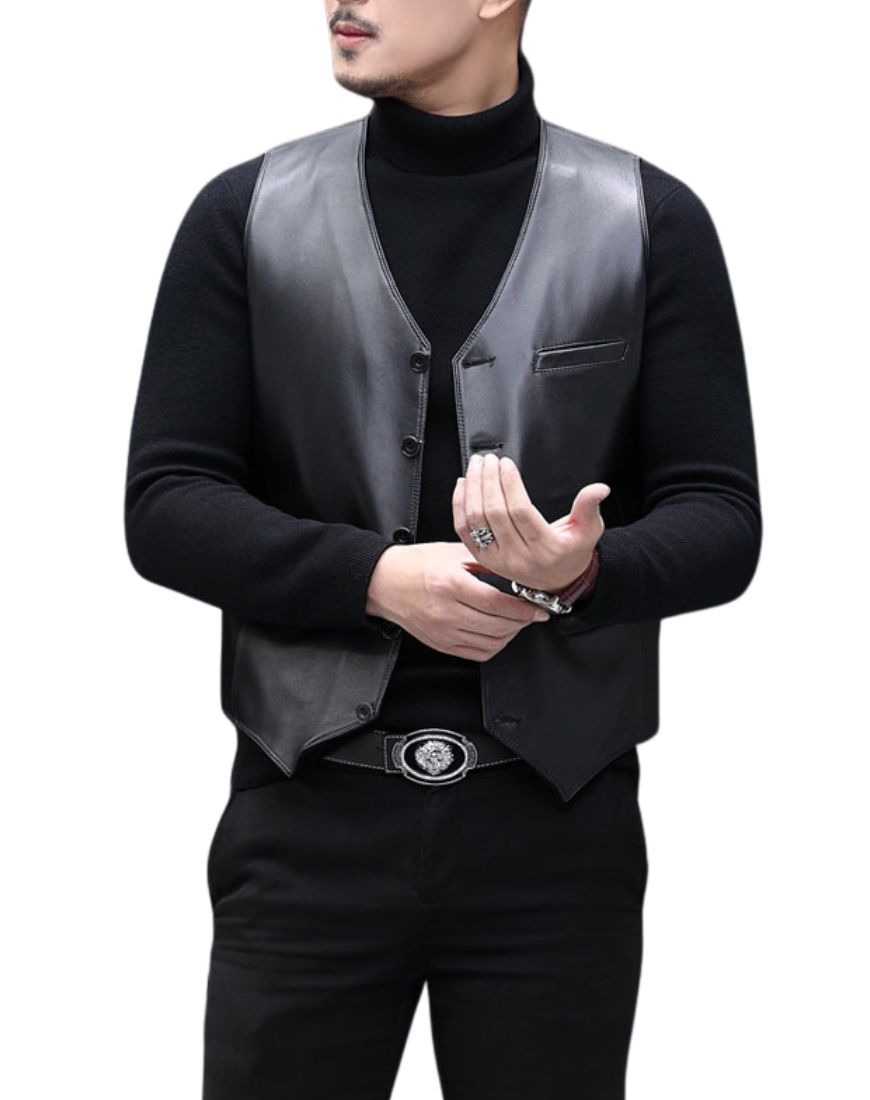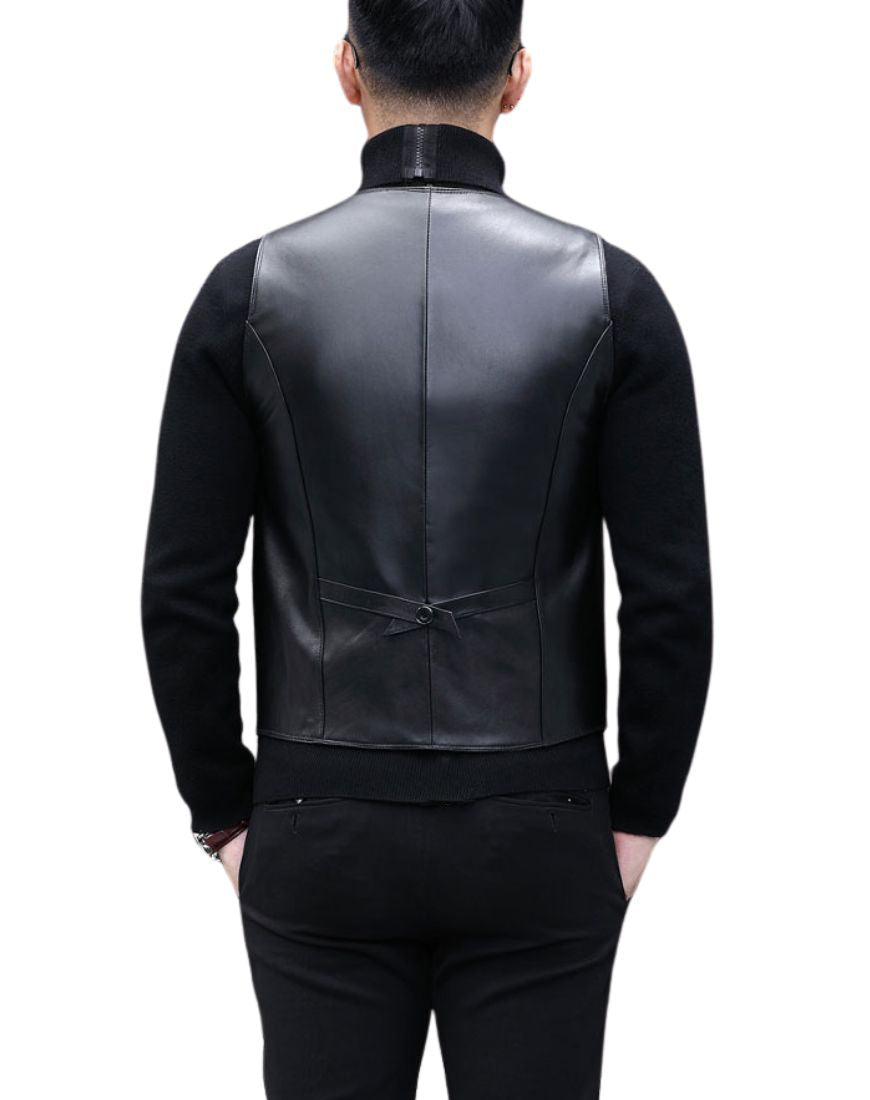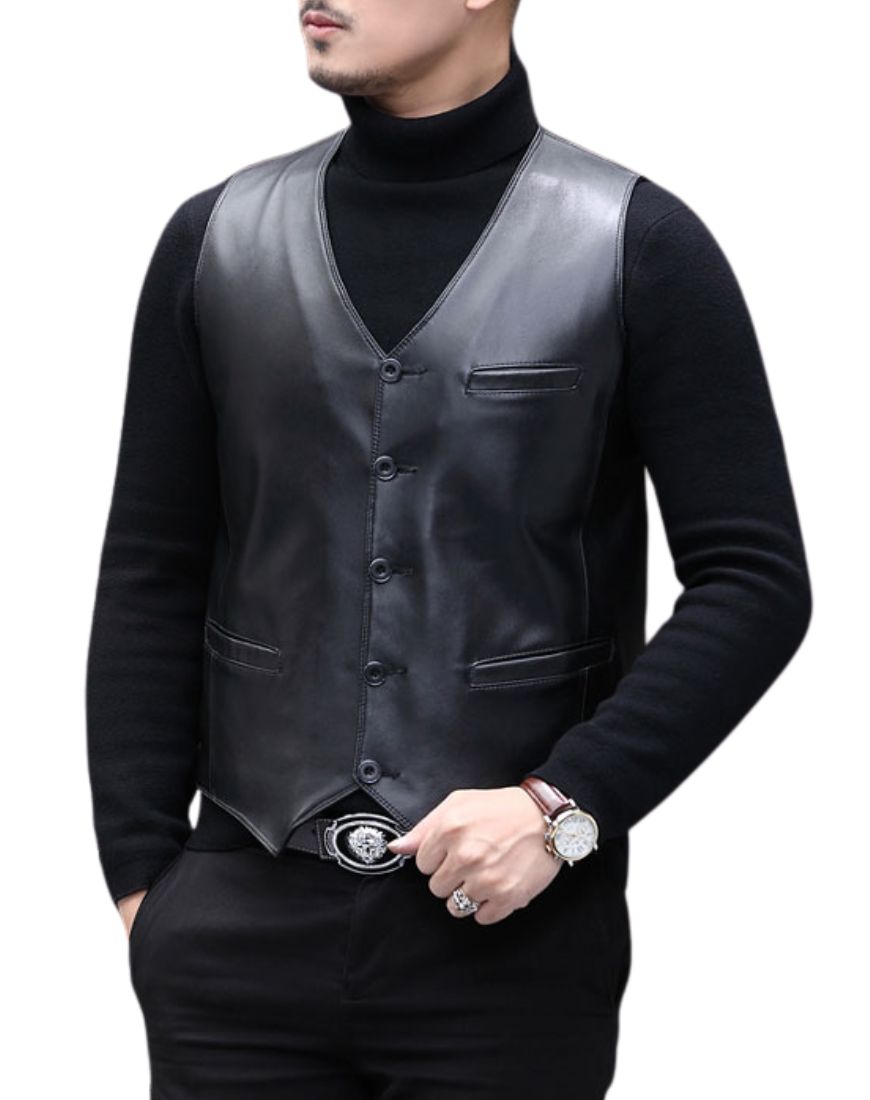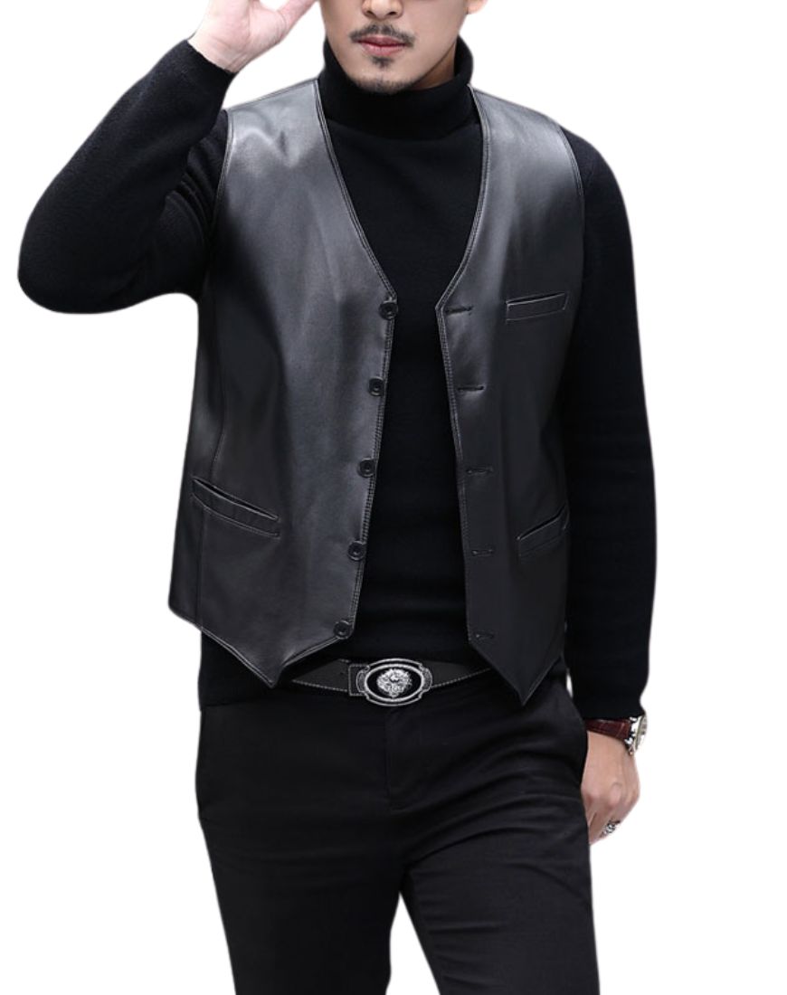 This black leather vest is fantastic. The lambskin leather is smooth and durable, providing a sleek look. The fit is perfect, and the vest feels sturdy yet comfortable. Great for adding style and warmth.