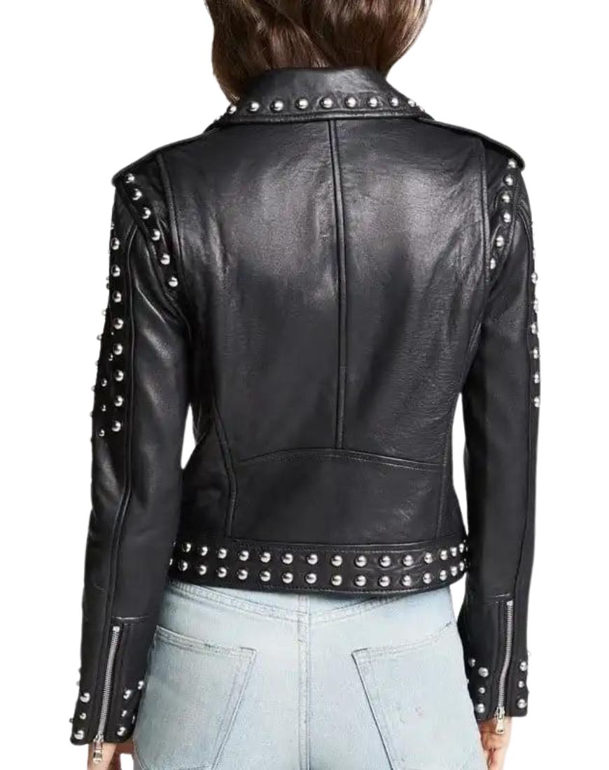 Im loving this studded black leather jacket! The lambskin leather feels incredibly soft, and the studs add a cool edge. Its stylish, fits perfectly, and the lining is super comfortable. Highly recommend!